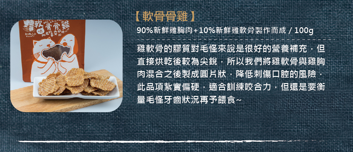 ・雞軟骨富含天然膠質,有助日常營養補充。我們將雞軟骨與雞胸肉混合製成圓片狀,口感更佳,同時降低尖銳邊角,讓毛孩吃得安心又美味。