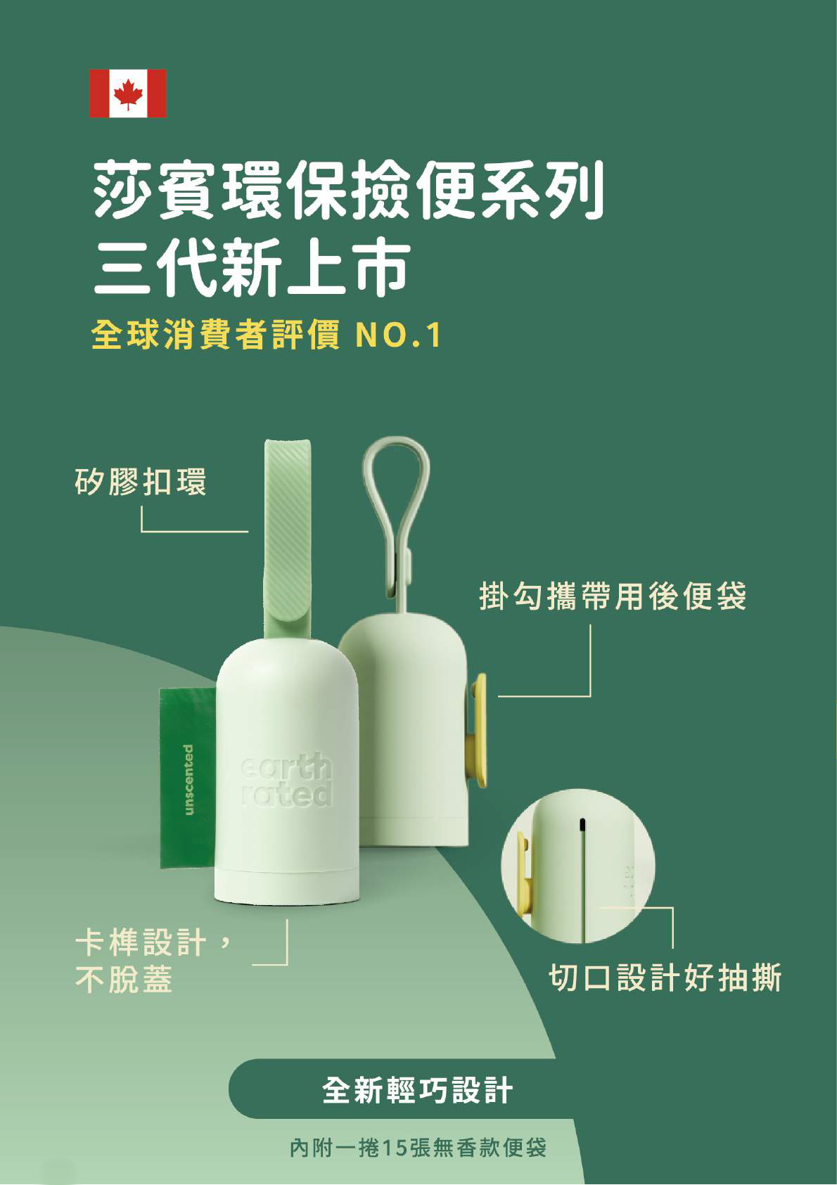 環保撿便器設計方便好用、外型簡約,內附 1 捲無香撿便袋(15入),日常外出更輕鬆。
